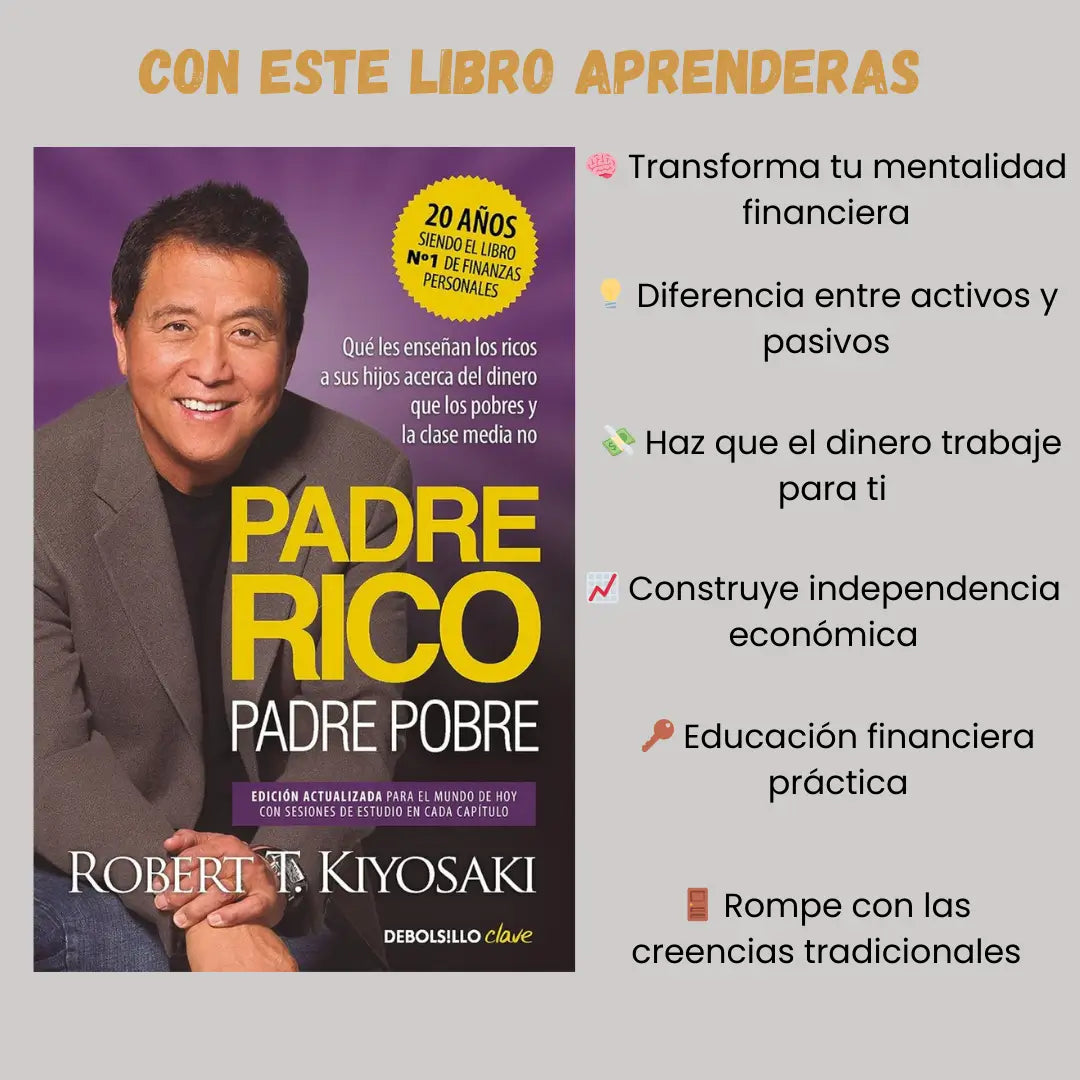 📖 Padre Rico, Padre Pobre de Robert Kiyosaki te muestra lo que nunca enseñan en la escuela: la diferencia entre activos y pasivos, y cómo los ricos construyen ingresos que trabajan para ellos.